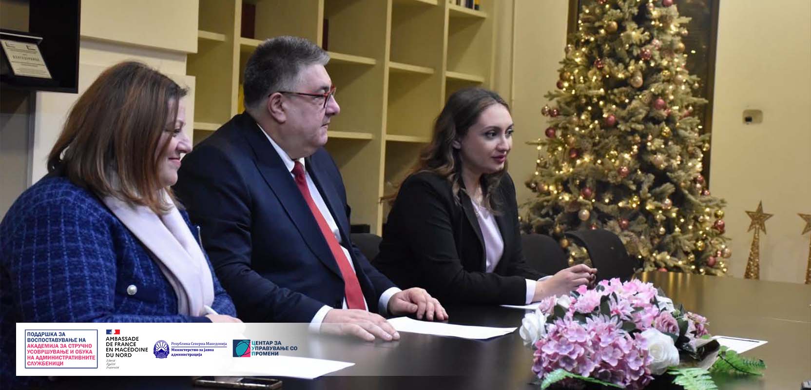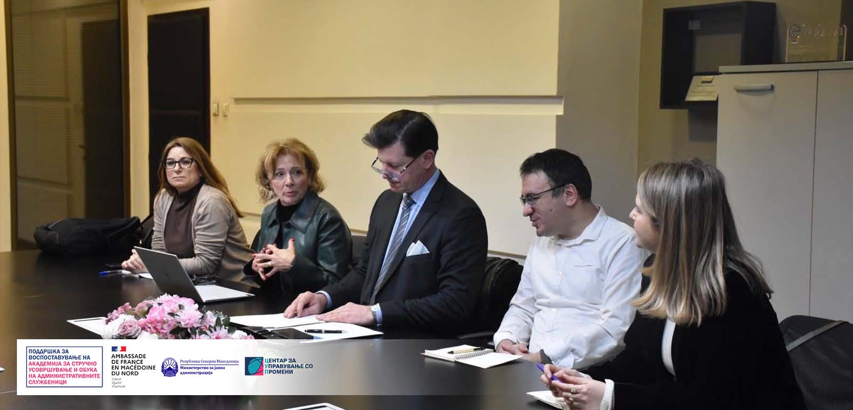 Proektot „Поддршка за воспоставување на академија за обука и стручно усовршување на административните службеници“, кој е поддржан од Амбасадата на Република Франција, а во соработка на Центарот за управување со промени (ЦУП) со Министерството за јавна администрација (МЈА).