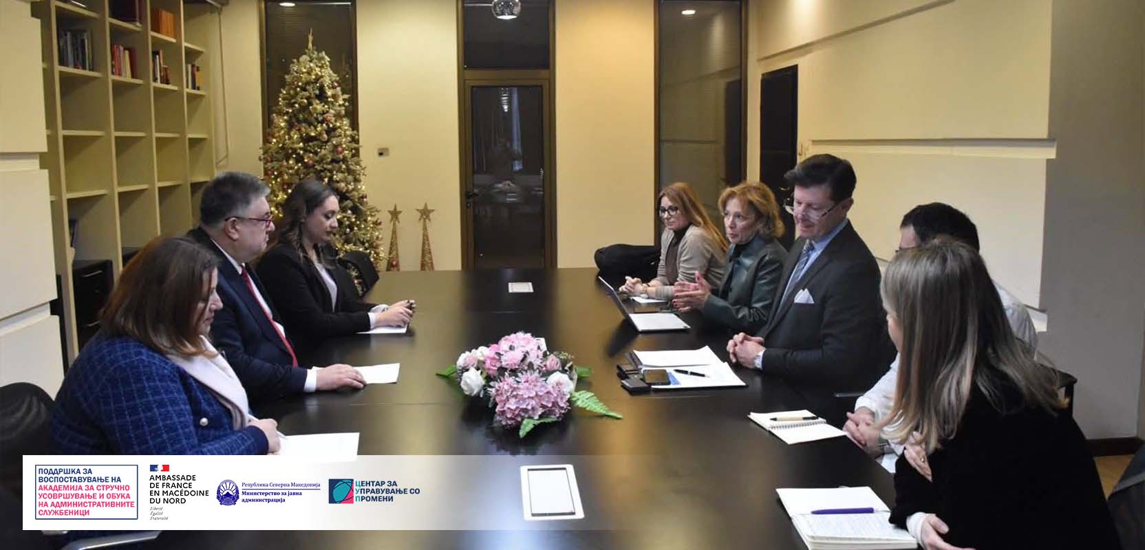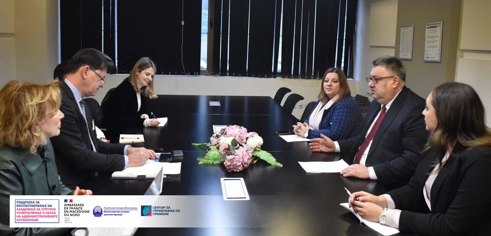 Во рамки на проектот "Поддршка за воспоставување на Академија за обука и стручно усовршување на административните службеници", извршната директорка на ЦУП Неда Малеска Сачмароска, проектната координаторка на ЦУП Анета Иванова Стојаноска и експертот проф. д-р Jean-Michel Eymeri-Douzans, остварија работна средба со министерот за јавна администрација Горан Минчев и раководителката на секторот за реформа на јавната администрација Есма Адиловиќ Фазлиќ.